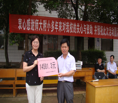 欢迎仪式结束后进行了捐赠仪式,李汶校长代表附小将11台电视机以及502本图书和全校学生在第十五届诚信图书交易会上的14538.1元爱心款捐献给了姚显微学校。二年级四班的同学还另外捐赠了六百元爱心中餐款。刘慧和校长代表姚显微学校全体师生感谢师大附小的善举,对师大附小学子的善心、善意表示诚挚的感谢。