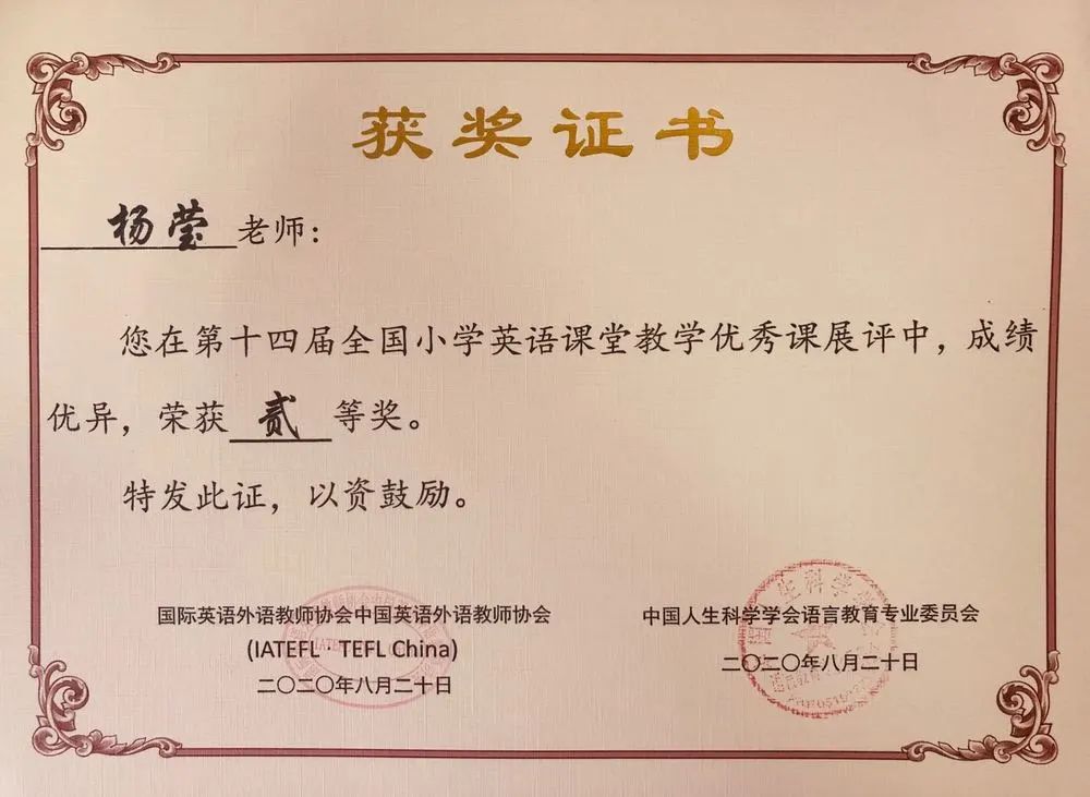 热烈祝贺18jav 杨莹老师在第十四届全国小学英语教师教学基本功大赛中荣获“小学英语课堂教学优秀课展评二等奖”。