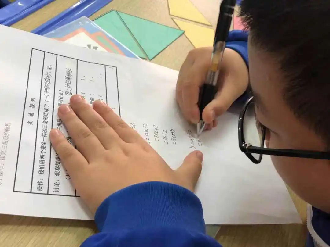 一节让人记忆犹新的公开课,短短的40分钟,学生不断的思考探索,通过思维的转化,寻找新知与旧知之间的联系,在合作交流、动手操作中学会了“三角形的面积”,最重要的是认识了幽默风趣、极具亲和力的邱老师。特别是有一道题,学生们全军覆没(没有注意到高和底要一一对应),但大家学的很开心,认识到这个问题今后再也不会犯了。原来课堂上的错误,也可以同样精彩,让人终生难忘,真好!