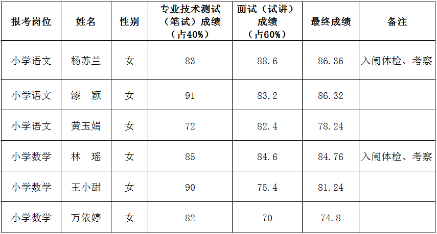 一、入闱体检、考察环节人员名单(含考生成绩)