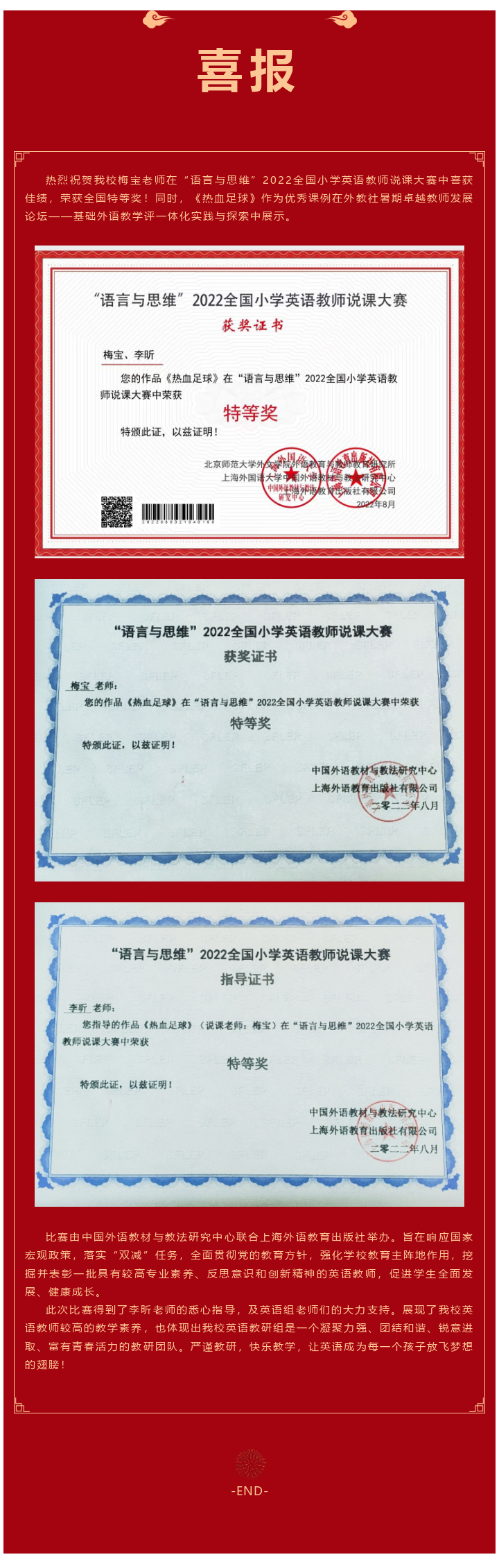 喜报 | 热烈祝贺18jav 梅宝老师荣获2022年全国小学英语教师说课大赛特等奖