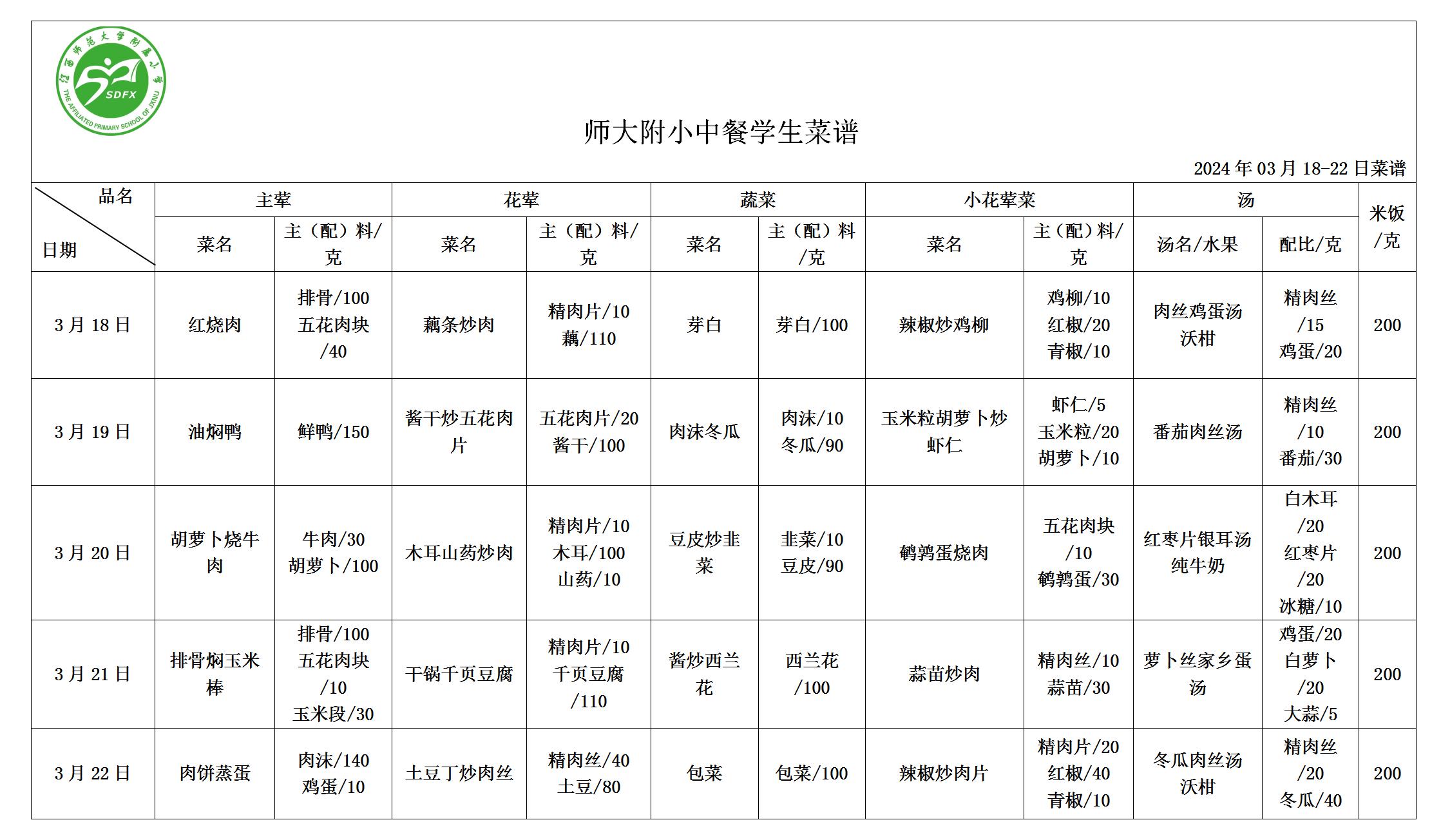 师大附小2024年3月18日-3月22日食谱