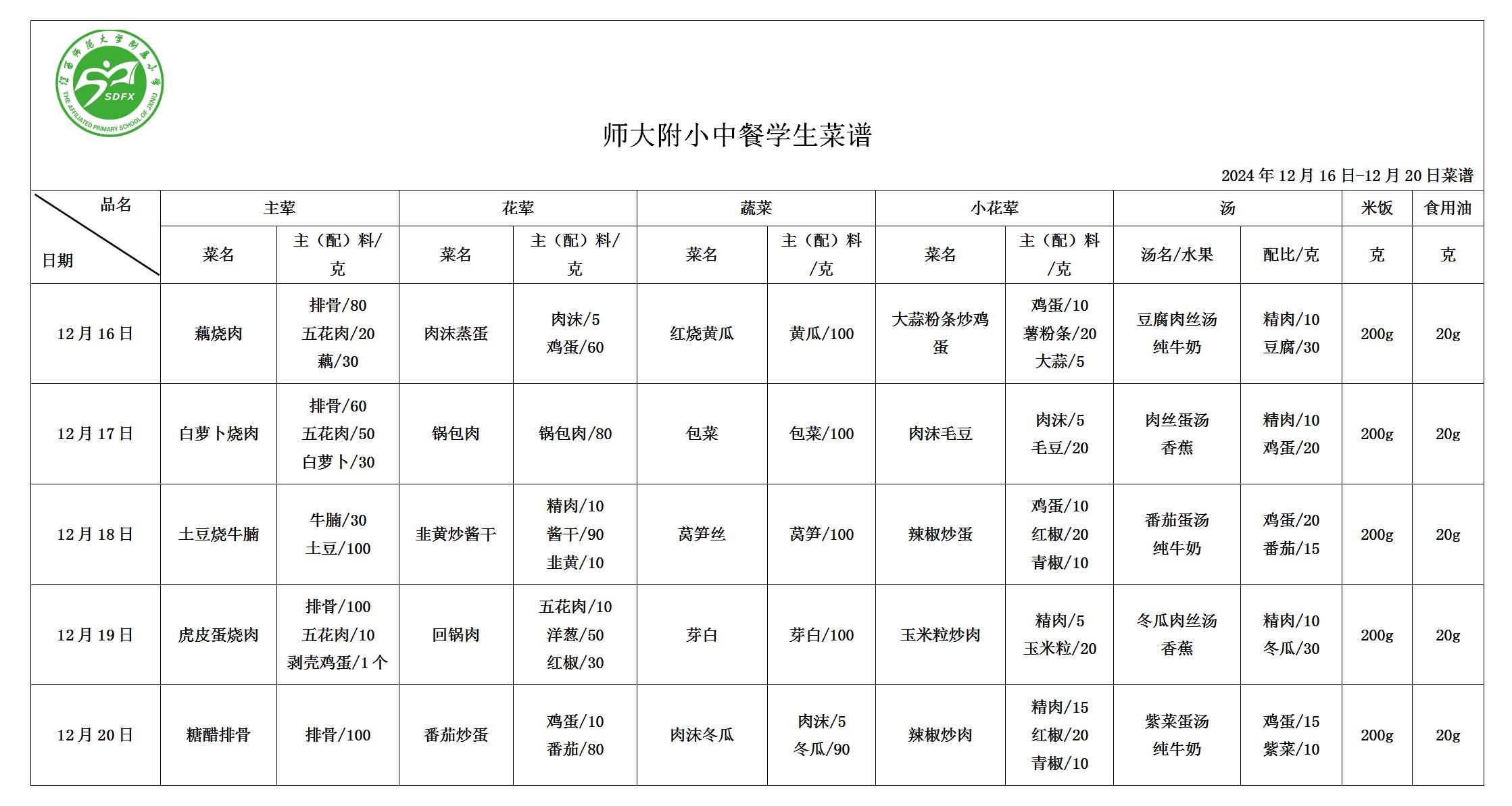 师大附小2024年12月16日-12月20日食谱